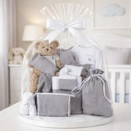 You can find baby baskets in pink, blue, and gray, and with a wide variety of products. Some of our baby hampers are more focused on bath time, containing a personalized bathrobe and towels, while others are focused on the baby's bedtime, containing personalized sheets and pillows, and others are more focused on the baby's playtime with our star product, the Nicky baby teether. Whatever type of newborn basket you're looking for, in this catalog, you'll find the perfect baby gift that will bring the most joy to the parents.