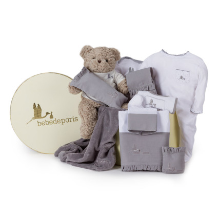 Serenity Plena Baby Hamper CUSTOMIZABLE Bebé de París C105GREY 211.95 € The Serenity Plena line, presented in a stylish vintage box, becomes the ideal gift for a newborn’s peaceful nights. Basic cotton bodysuit Star-print cotton pyjamas Crib sheet set Stroller blanket Hat, booties and mittens set Pacifier holder Baby bottle holder Nursing muslin cloth Doudou Bunny 30 cm teddy bear Vintage-style box... Add to cart